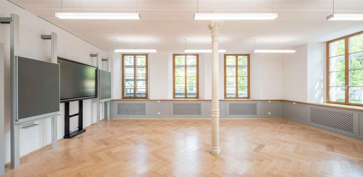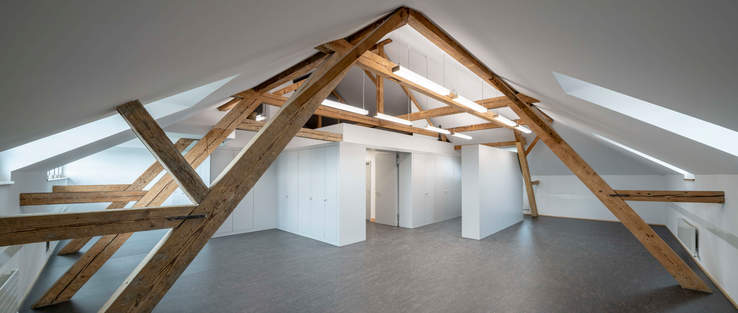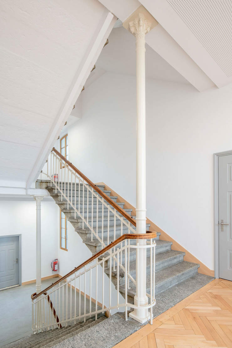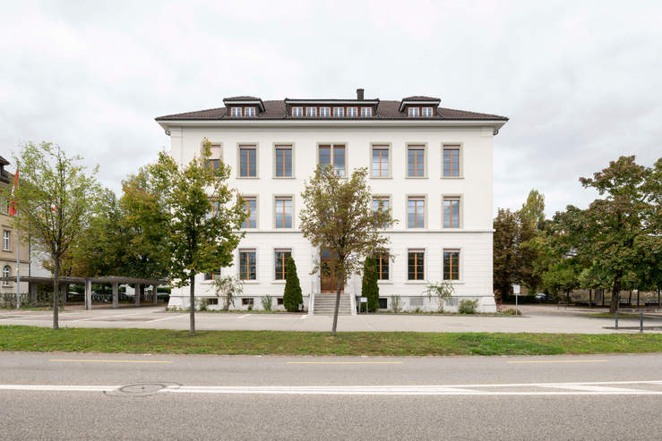 Die neuen Eichenfenster mit der charakteristischen Fensterteilung und die textilen Markisen prägen zusammen mit der klassizistischen Profilierung des Putzes im Erdgeschoss und den Gebäudeecken die äussere Erscheinung. In den Schulräumen schaffen das umlaufende Brüstungstäfer, welches die Heizungs-und Elektroverteilung integriert, der Fischgratparkett, die Akustikdecken, die eingebauten Wandschränke und die neue Beleuchtung eine gute Atmosphäre für den Unterricht. Im Dachgeschoss wird die Primärkonstruktion und das Raumvolumen unter dem Walmdach freigespielt und mit dem Lichteinfall über die Dachlukarnen ein heller attraktiver Lehrerarbeitsraum gestaltet.