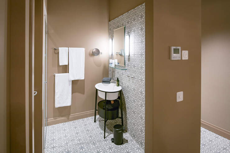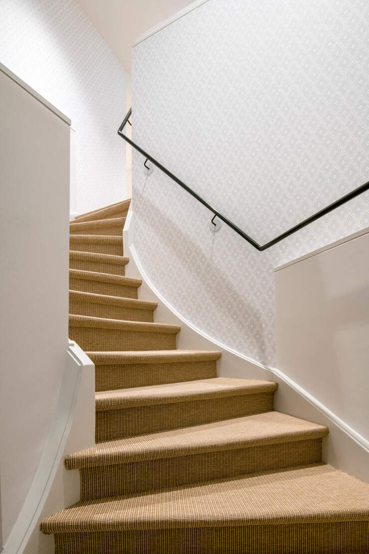 Das Haus wurde sorgfältig erneuert. Das Erdgeschoss wird weiter als Garage genutzt, das Parkplatzlayout wurde jedoch optimiert auf die Grösse heutiger Fahrzeuge. Ein neuer einladender Eingangsbereich erschliesst die neun neuen Hotelzimmer die dem Gebäude im Obergeschoss anstelle der Angestelltenzimmer einbeschreiben wurden. Über die Treppe oder den Lift gelangt man in den in der Gebäudemitte liegenden Korridor. Die Oberlichter bringen natürliches Licht in das Treppenhaus und den Korridor und inszenieren den Weg des Hotelgasts.