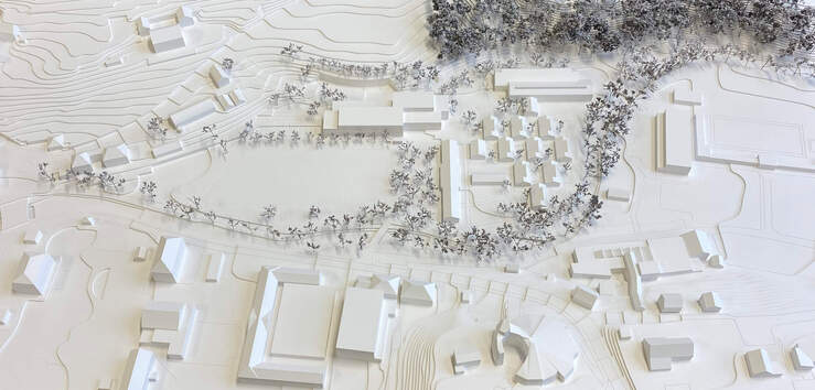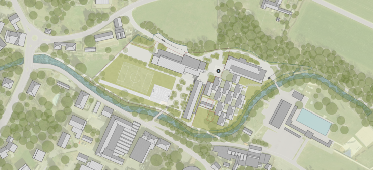 Der Ergänzungsbau ersetzt die aus dem Schutz entlassene Turnhalle 4 und fügt sich mit zwei Voll- und einem Attikageschoss in den Geländesprung ein, ohne die Sichtbeziehungen zu Schloss und Landschaft zu beeinträchtigen. Durch seine Setzung entstehen ein zentraler Platz im Osten, ein grosszügiger Pausen- und Sportbereich im Süden sowie ein neuer Vorplatz zur Dreifachturnhalle im Norden. Das Areal wird in eine obere Ankunftsebene und eine untere Freizeit- und Sportebene gegliedert, mit Rasenspielfeld, Allwetterplatz, Laufbahn und beschatteten Aufenthaltsbereichen.