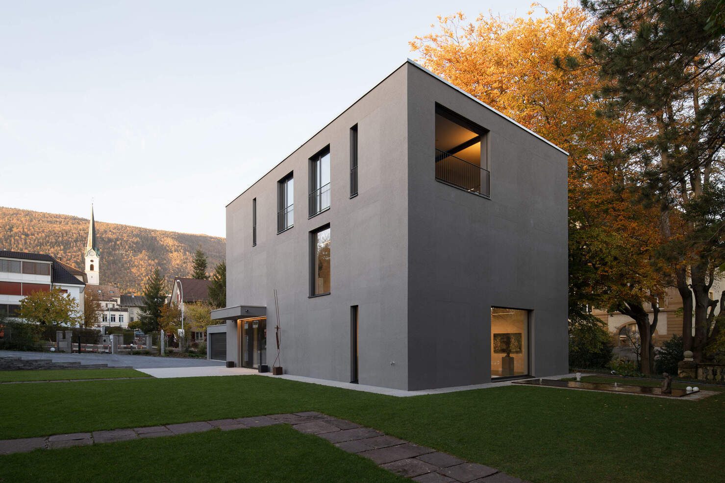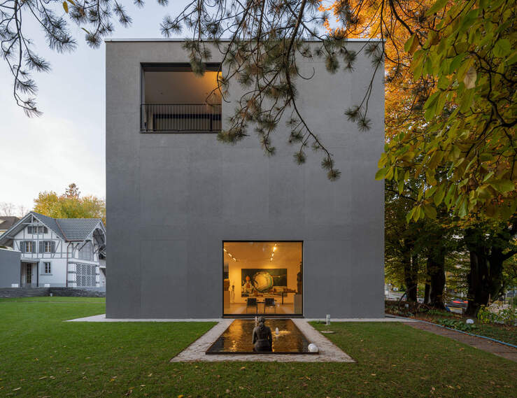 Auf dem Grundstück an der Gibelstrasse 1 in Grenchen wurde ein privates Schaulager für die Kunstsammlung Dr. Hanspeter und Christine Rentsch realisiert. Der Ort und das Areal werden durch folgende bestehende Elemente geprägt: Die mächtigen mehrstämmigen, skulpturartigen Bäume entlang der Bahnhofstrasse, die zeittypische grob verputzte Umfassungsmauer mit Mauerpfeilern und Lattenzaun entlang der Bahnhof- und der Gibelstrasse, die grosszügige Gartenanlage und das historische Kutscherhaus in der Nordwestecke. Ausgehend von diesen Elementen des «Genius Loci» wurde der Neubau als dreigeschossiges einfaches quaderförmiges Gebäudevolumen in Längsrichtung entlang den Bäumen an der Bahnhofstrasse platziert, um einen möglichst grossen parkartigen Gartenraum zwischen Neubau und bestehendem Kutscherhaus aufzuspannen.