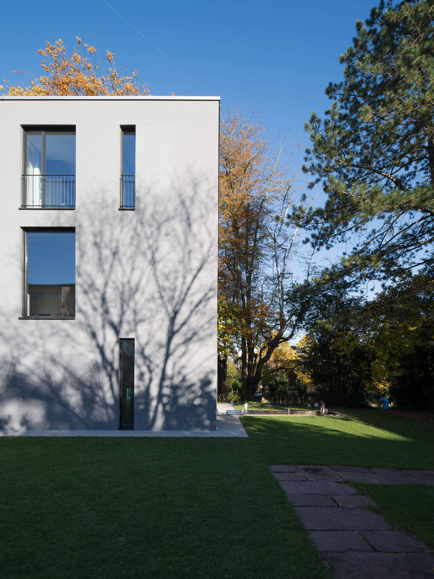 Das Volumen ist im Grundriss und im Längsaufriss jeweils im Verhältnis des goldenen Schnittes gestaltet. Die kurzen Fassaden bilden exakt ein Quadrat. Die Nutzung erfordert zum grossen Teil geschlossene Aussenwände. Ein Raster umspannt alle vier Fassaden des Gebäudes und teilt die Flächen geschossweise in Felder ein, welche wiederum im Verhältnis des goldenen Schnittes sind. Dies eröffnet die Möglichkeit die Bereiche ganz nach Bedarf als geschlossene Wandfelder oder als Öffnungen zur Belichtung und zum Ausblick auszubilden und dennoch ein geordnetes und ruhiges Fassadenbild zu erhalten. Der Baumbestand wurde weitgehend erhalten.