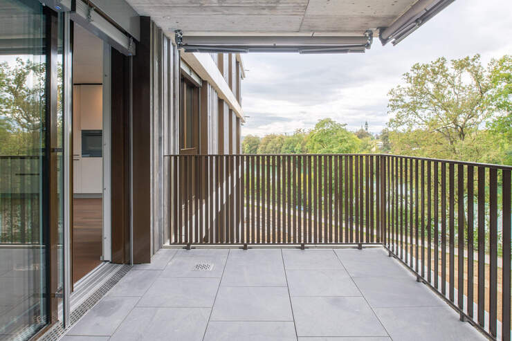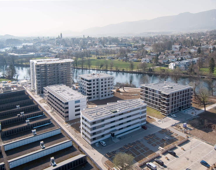 Die erste Bauetappe des Areals befindet sich im Nordwesten direkt an der Aare. Dort werden 5 Häuser mit 140 Wohnungen realisiert.