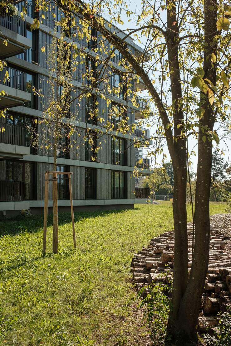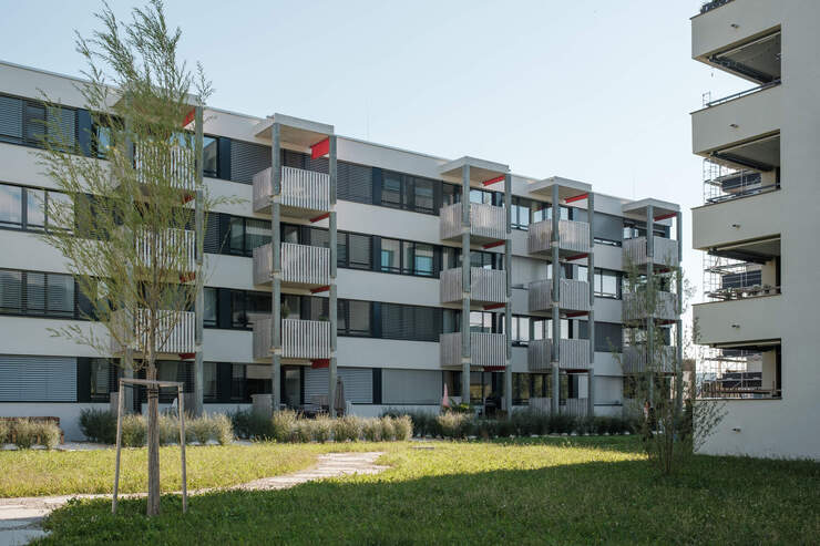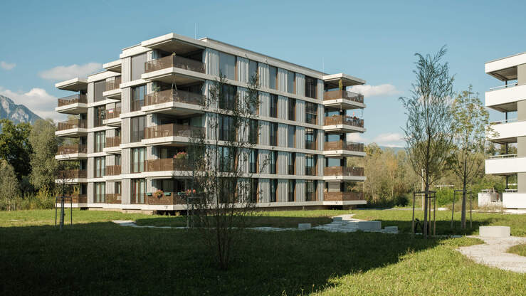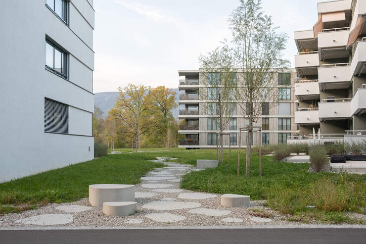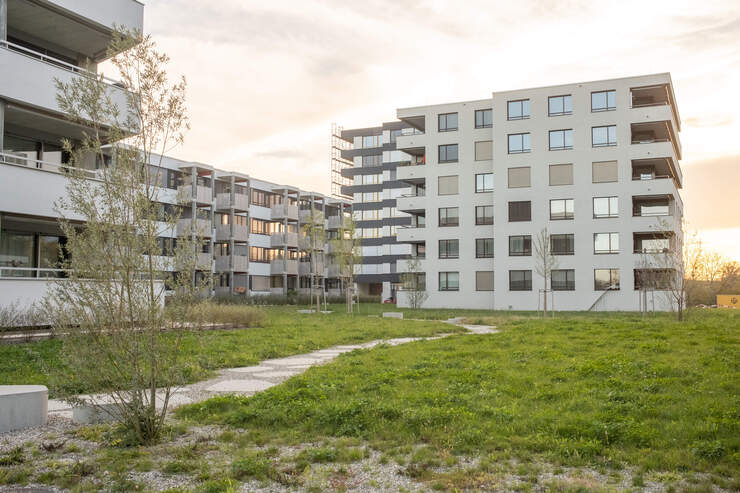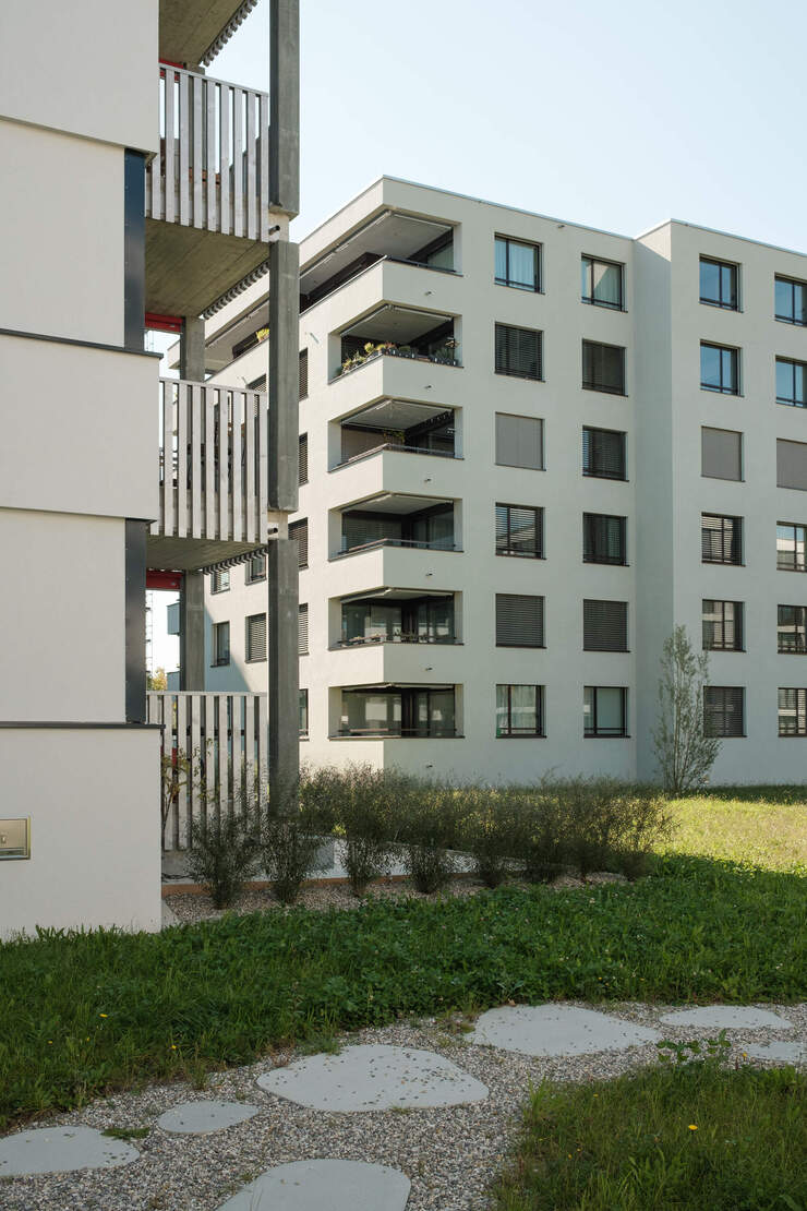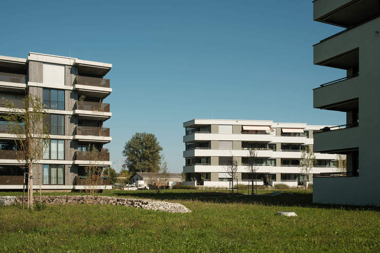 Die fünf Wohnhäuser weisen zwischen vier und neun Geschosse auf, unterscheiden sich in ihrer Gebäudetypologie und Erscheinung und bieten im Einzelnen wie auch in der Summe eine grosse Vielzahl von Wohnungstypen an, die eine breite Palette künftiger Einwohner anziehen sollen.