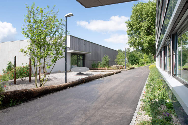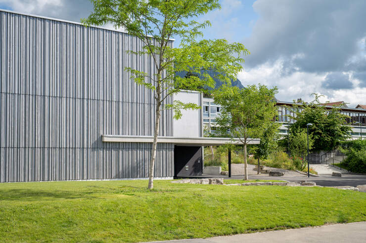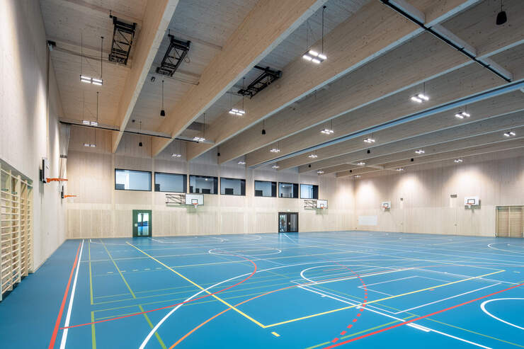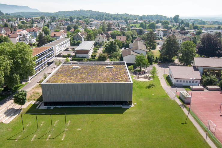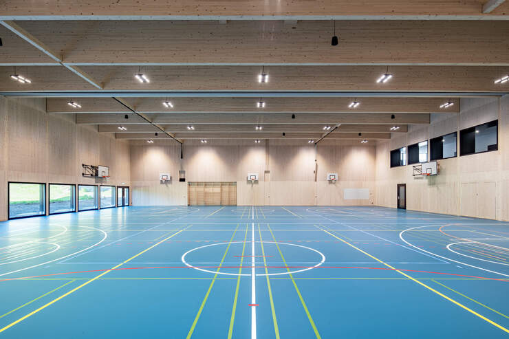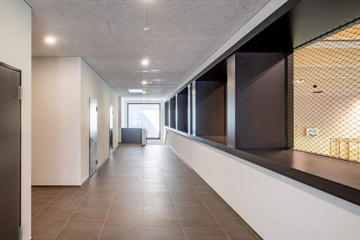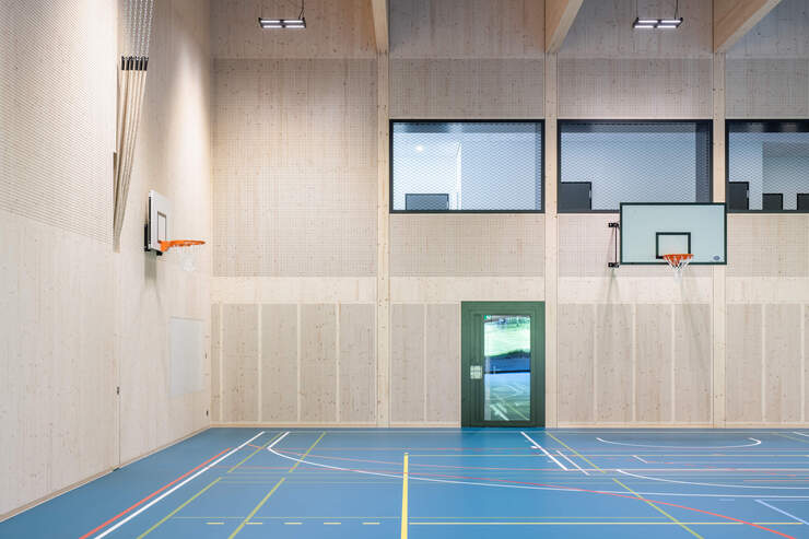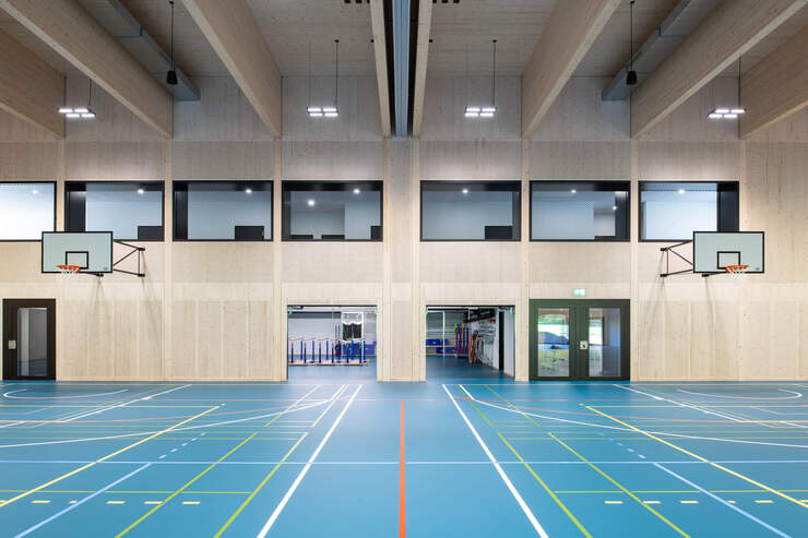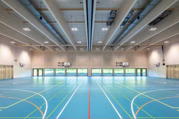 Im Zentrum der Schulanlage befindet sich das Gebäude E, das im Rahmen der Schulraumerweiterung zur Doppelsporthalle mit grosszügigem Eingangsbereich erweitert wurde. Die Leichtbaukonstruktion aus Stahl der bestehenden Halle wurde zurückgebaut und eine neue Doppelsporthalle in Holzbauweise erstellt, die den BASPO- und BFU-Vorgaben entspricht. Ein neuer Lift ermöglicht die hindernisfreie Verbindung der Aussenräume von Oberstufe und Primarschule, zu denen die Doppelsporthalle jeweils einen Eingang mit Vordach ausbildet. Die Garderoben und Duschräume anstelle der ehemaligen Werkräume werden über eine Serie von