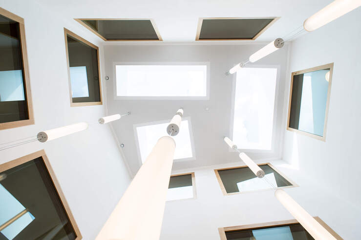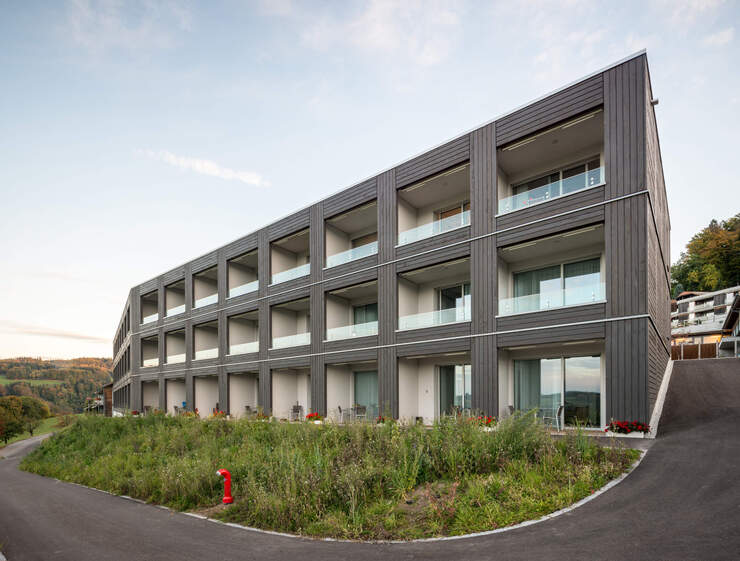 Die städtebauliche Setzung des Neubaus anstelle des Hauses E schliesst die historische Anlage des Schlosses seitlich ab. Der Neubau vereint in sich die Geometrien vom Schloss und den Bettenhäusern und schafft so eine selbstverständliche Verbindung, welche die Bewegung des Hangs aufnimmt. Durch seine Form schafft der Neubau hangseitig die städtebauliche Verbindung der Infrastrkutrgebäude mit den Bettenhäusern. Der Neubau übernimmt die Koten der Terrassierung für die Lage der Geschosse, was eine stufenfreie Anbindung des Hauses an die Gartenanlage und die bestehenden Häuser garantiert. Die Zimmer sind alle zur Aussicht hin auf die gut besonnte Südostseite angeordnet. Die Wohnräume und die Nebenräume sind zur Anlage hin ausgerichtet. der zentrale Lichthof bringt zusätzliches Licht in den Erschliessungsbereich und den Wohn- und Aufenthaltsraum und ermöglicht visuelle Verbindungen zu den anderen Wohngruppen.
