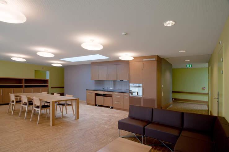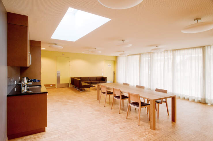 Das Wohnheim bietet 50 erwachsenen Menschen, die körperlich, geistig oder mehrfachbehindert sind ein Zuhause. Besonderes Augenmerk wird dabei dem Umstand gewidmet, dass behinderte Mitmenschen heute eine zunehmend längere Lebenserwartung haben. Deshalb sind 16 Plätze für Behinderte im Seniorenalter erstellt. Der zweigeschossige Bau ist in sechs Wohngruppen zu je acht Zimmern mit einem gemeinsamen Wohn- und Essbereich und zwei Wohnstudios für noch selbständige Bewohner unterteilt. Die gemeinsame Infrastruktur enthält eine grosse Beschäftigungsstätte, einen um den Mehrzweckraum erweiterbaren Essraum, eine gewerbliche Küche und alle notwendigen Verwaltungs- und Nebenräume. Die gewählte Zweigeschossigkeit des Baukörpers nimmt Rücksicht auf das umliegende, zukünftige Quartier, welches mit Einfamilienhäuser überbaut wird. Durch die versetzte Anordnung der Wohngruppen wird das Bauvolumen gegliedert und es werden attraktive Aussenräume geschaffen.
