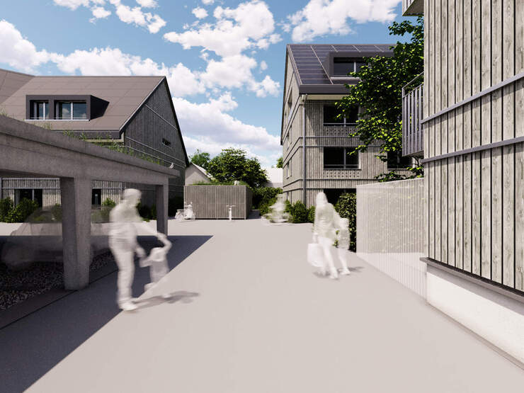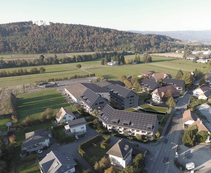 Die zwei- und dreigeschossigen Gebäudevolumen mit je zwei Dachgeschossen unter den Satteldächern sind um das Bauernhaus so angeordnet, dass ein offener Freiraum entlang der Hauptstrasse gebildet wird, in welchem die eingeschossige gedeckte Parkierungsanlage platziert ist. Die nach Südwesten ausgerichteten Neubauten fügen sich in ihrer Struktur und Gebäudeform massstäblich in die Geometrie des angrenzenden Quartiers ein. Die Gebäudevolumen gliedern sich mit ihren markanten Dächern und Dachaufbauten in die ländliche Typologie der Bauernhäuser ein.